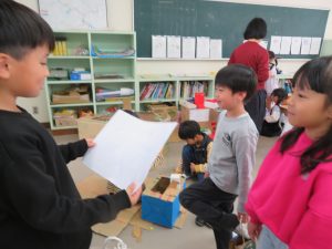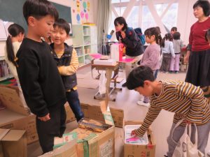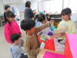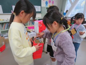 早速、帰園して廃材を利用して玩具づくりをしたり、プレゼントしてもらった玩具の使い方を年下のお友達に教えてあげる子ども達でした。小学校の卒園児の成長ぶりも嬉しい先生達でした。