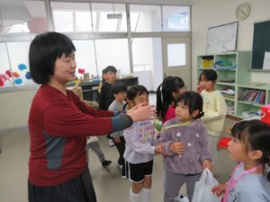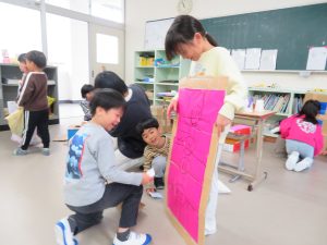 「おもちゃ大会をしよう!」という事で、城井小学校へ年長さんが訪問し、1・2年生のお兄ちゃんお姉ちゃん、三慧保育園の年長さんと交流してきました。手作り玩具の「しくみ」に興味を持ち、しっかりと小学校の先生の話をよく聞き、交流を深めながら楽しんで遊びました!