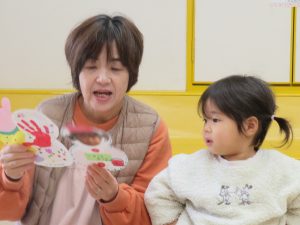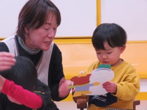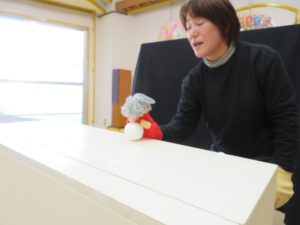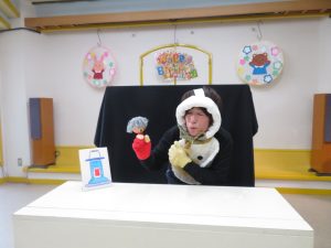 1月のお誕生日会では、手作りカードも雪だるま! 保育士のシアターも雪だるま登場。手作りの被り物が可愛いシアターでした。 雪がストーブの熱で溶けるシーンがあり、未満児のお友達にも小さな「科学の芽」が芽生えたようでした!